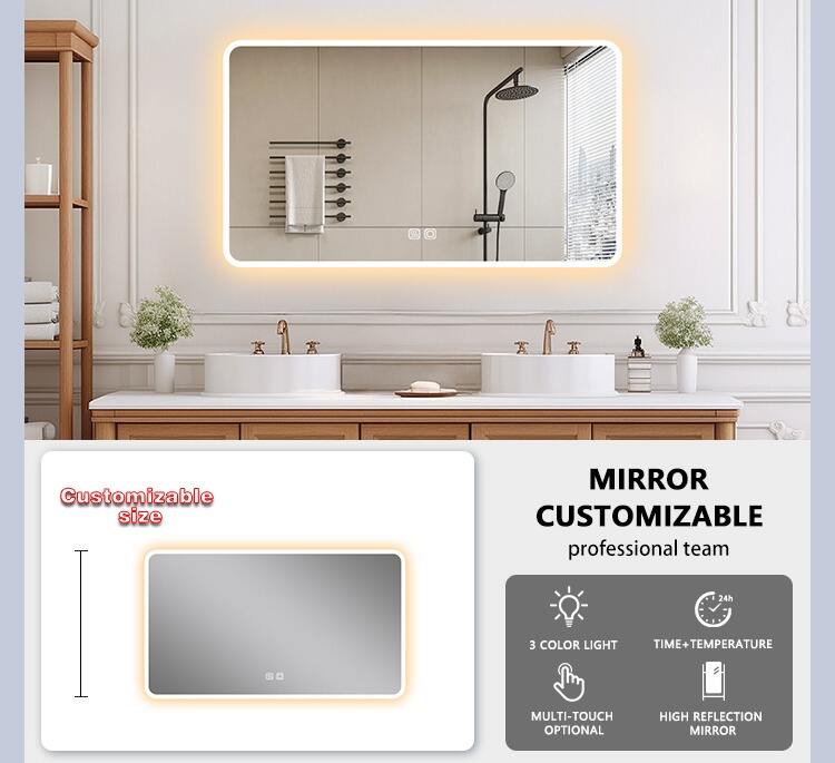 Ia menyokong saiz yang boleh disesuaikan, kawalan multi-sentuh, cermin perak berkualiti tinggi, pencahayaan boleh laras, dan fungsi pintar untuk mencipta pengalaman moden dan peribadi.